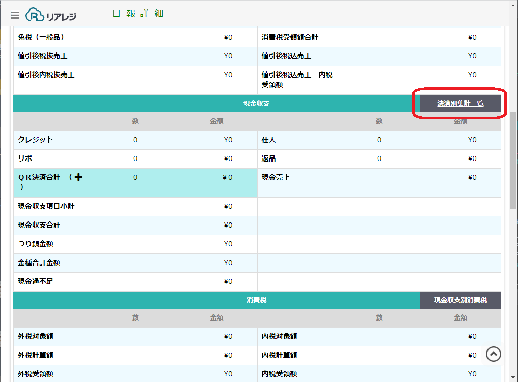 決済別集計一覧はリアレジメインメニューの「日報」から「日報詳細」を開いて「決済別集計一覧」を押して閲覧できます