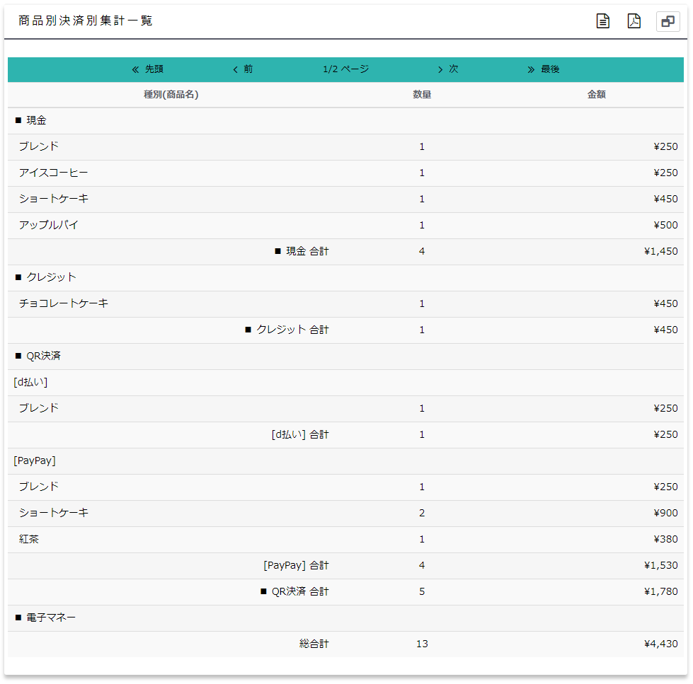 決済別に販売された商品の点数と金額を集計します