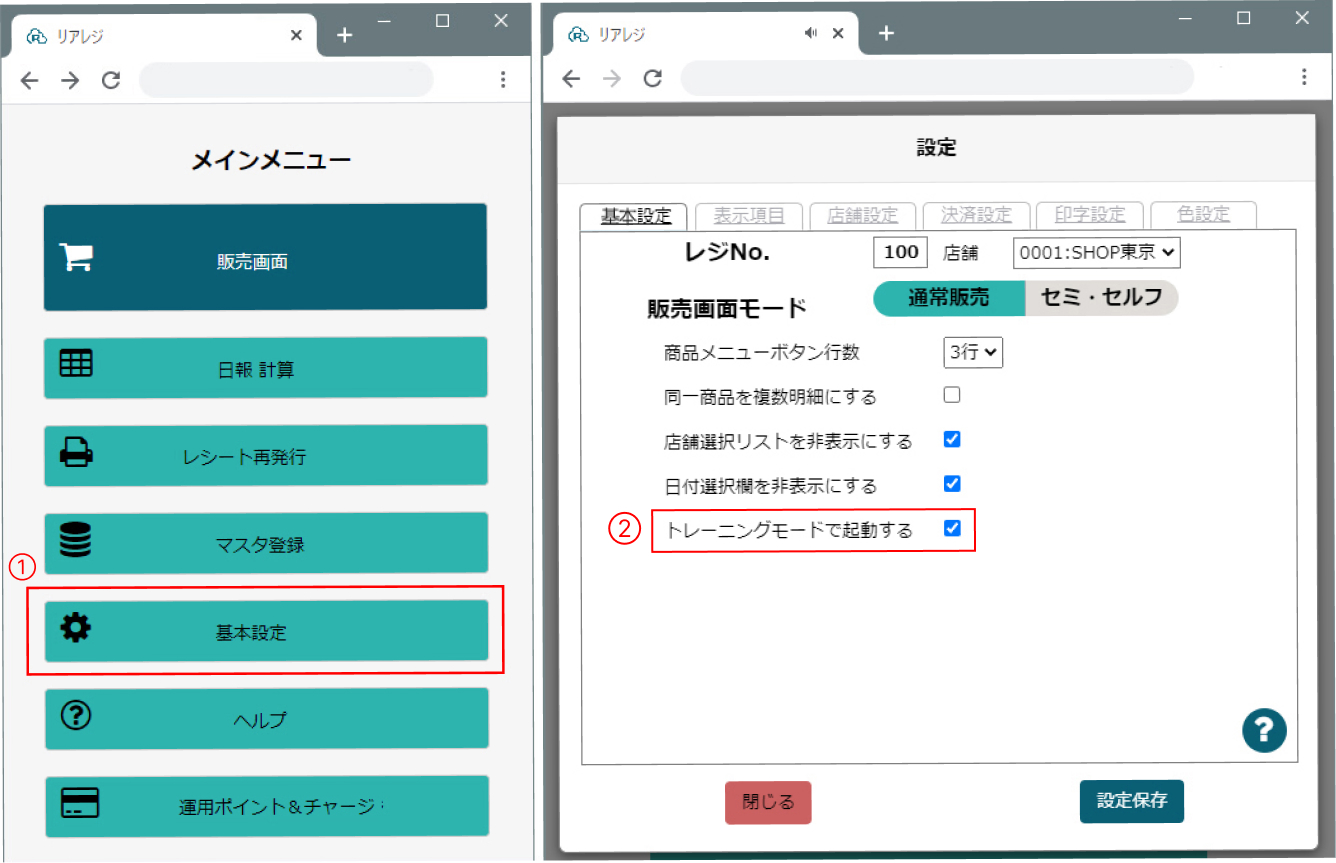 販売画面を閉じるか、販売画面ブラウザタブの「✖」を押してメインメニューを表示します 1-「レジ基本設定」を押します 2-レジ基本設定「店舗設定」を押します 3-「税率変更機能使用」を「しない」に設定 4-「設定保存」を押します 5-メインメニュー「販売画面」を押します