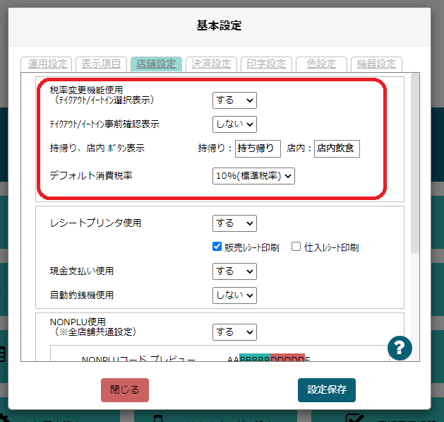 通常時の消費税を10%(標準税率)と8%(軽減税率)どちらにするか設定できます
