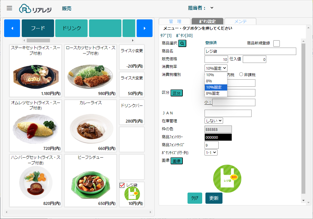 「テイクアウト/イートインを切り替え」の運用を行う場合、レジ袋や容器などテイクアウト時も通常の税率で販売する場合は「10%固定」を登録します