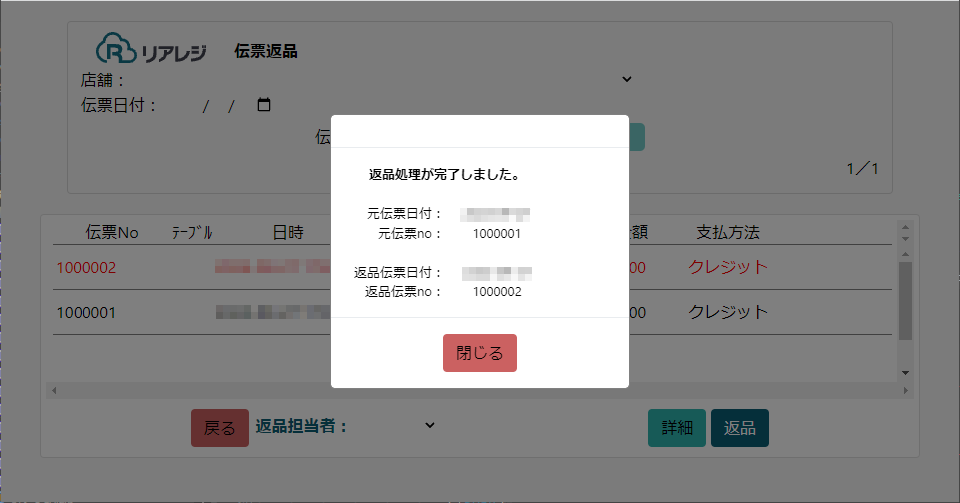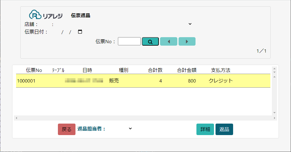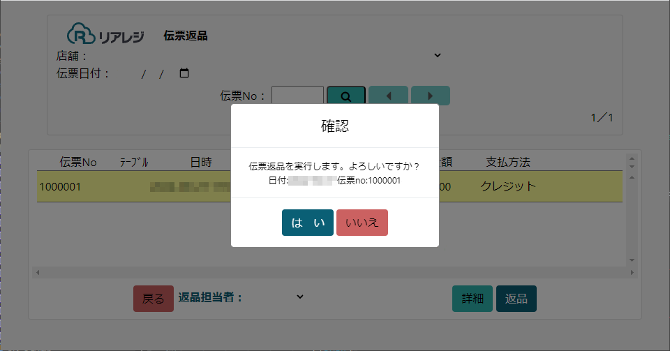販売画面左上赤枠の「メニュー」を押してから「伝票返品」を押します