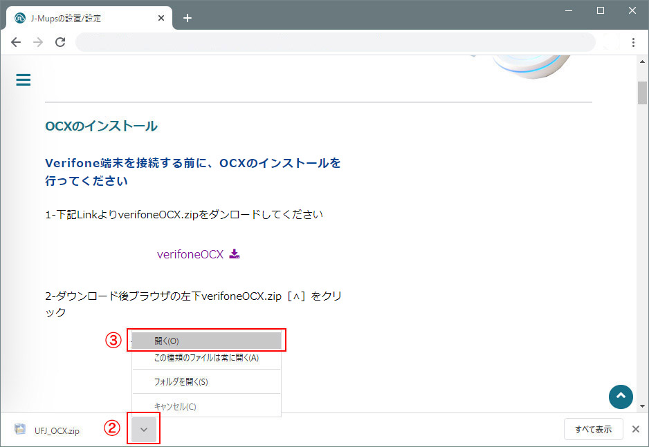 2-ダウンロード後ブラウザの左下verifoneOCX.zip[∧]をクリック 3-「開く」を押します
