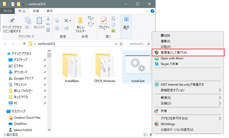 4-verifoneOCXフォルダ内の「install.bat」を右クリックし 「管理者で実行」を押します